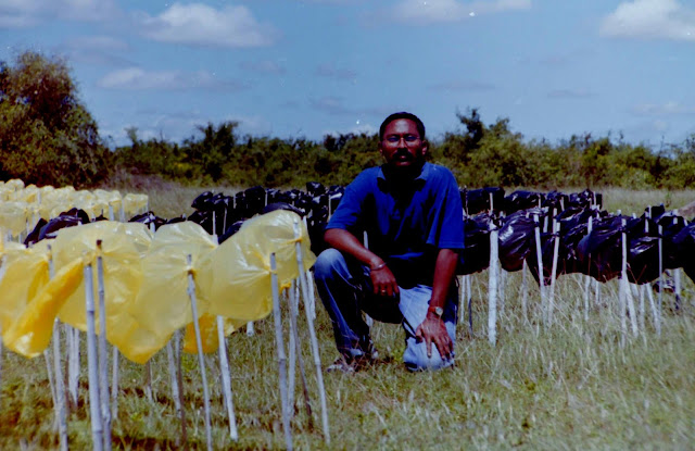 A view of Poly Farming, Environmental Installation with 2000 polythene bags and 2000 bamboo sticks, grouped as 100 in each spiral, to mark the year 2K with the industrialization and its effects on human lives. A social statement against the use of polythene bags.